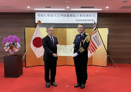- 北多摩西部消防署にて「令和7年度火災予防業務協力者等表彰式」が開催され、このたび 「火災予防業務協力功労 消防署長賞」 として感謝状をいただきました。